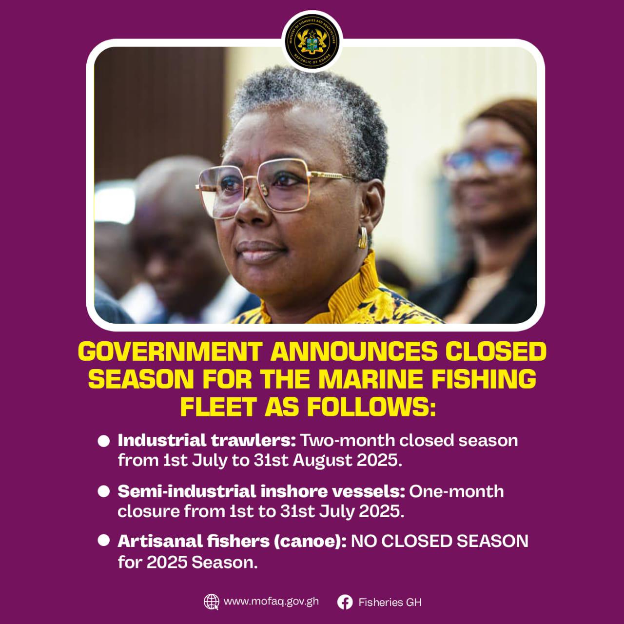 In a press release dated June 23, 2025, the Ministry revealed that industrial trawlers will be banned from fishing between July 1 and August 31, 2025, while semi-industrial inshore vessels will observe a one-month closure from July 1 to July 31.